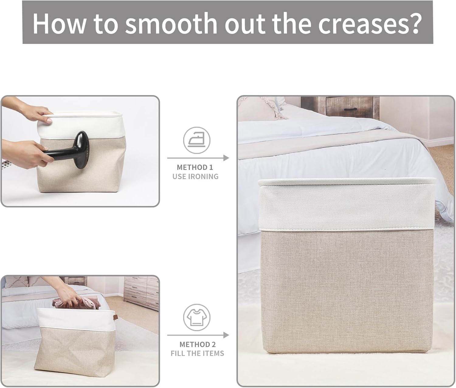 - 【Maintenance & Care Tip】 - Collapsible design for space saving. Our foldable baskets comes in a compression packing which may result in wrinkled storage bin during the long transit. Get rid of the wrinkles by either stuffing the fabric storage bins with blankets and pillows for a few days or steam iron them at low-heat setting. The organization baskets are easy to clean, you can dust the basket with a soft cloth with light soapy water when needed. Not recommended to machine wash.