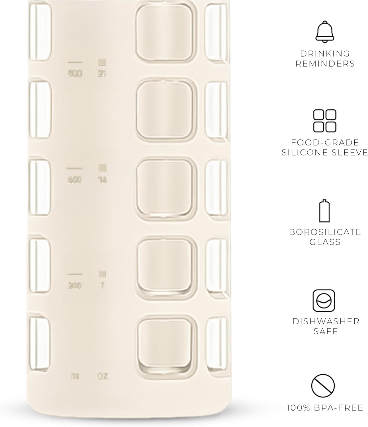 purifyou 40oz / 32oz / 22oz / 12oz Borosilicate Glass Water Bottle with Time & Volume Markers, Silicone Sleeve, Stainless Steel Lid – Reusable Glass Bottle for Water & Juice (32oz Pearled Ivory)