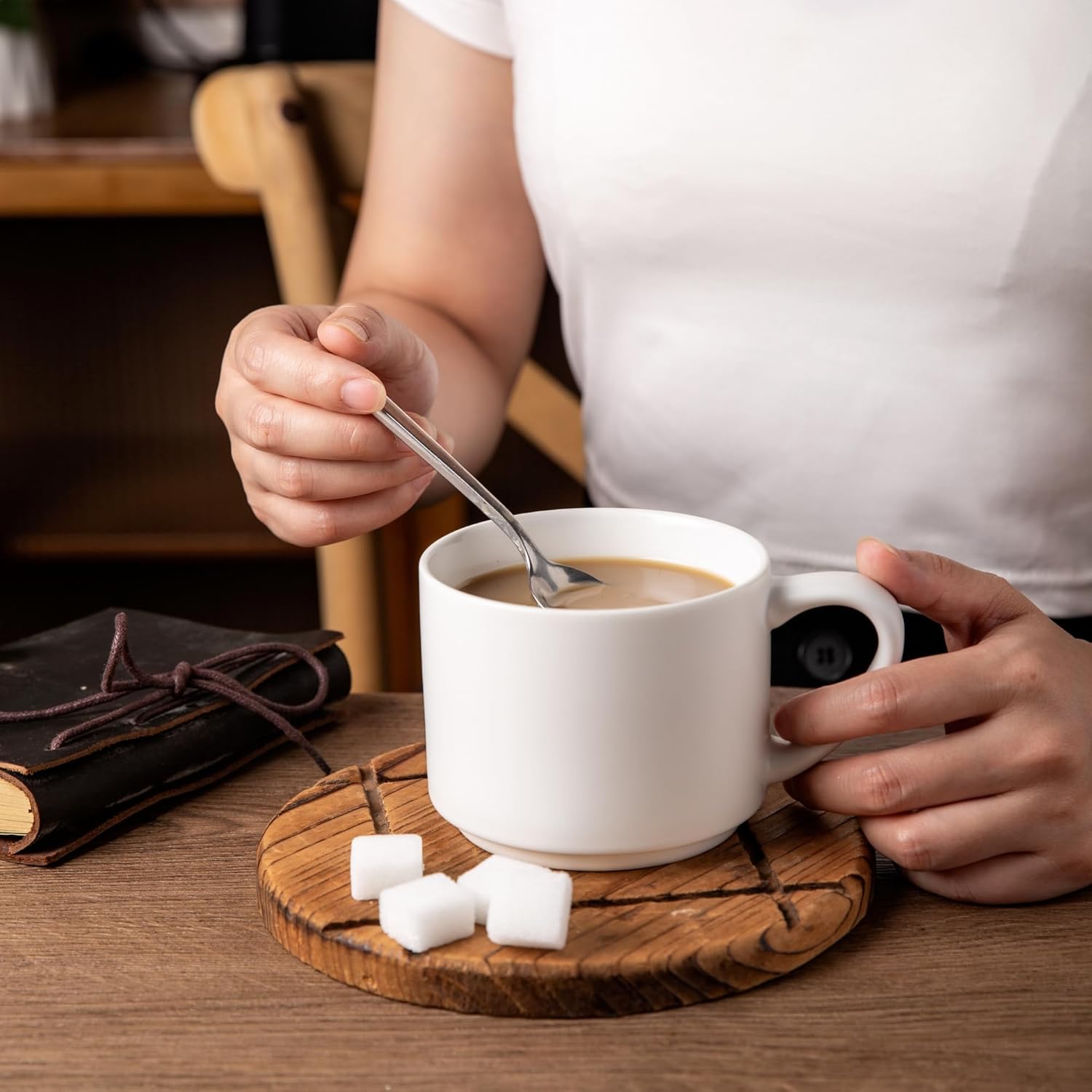 - Stylish DesignWIth Large Handle Design: These coffee mugs features a large handle that provides a comfortable and secure grip. the handle remains cool even after microwaving and the beverages stay warm. These mugs set feature a beautiful embossed texture design, the smooth rim ensures a comfortable drinking experience, and the stackable design allows for easy storage and helps save space in your kitchen.
