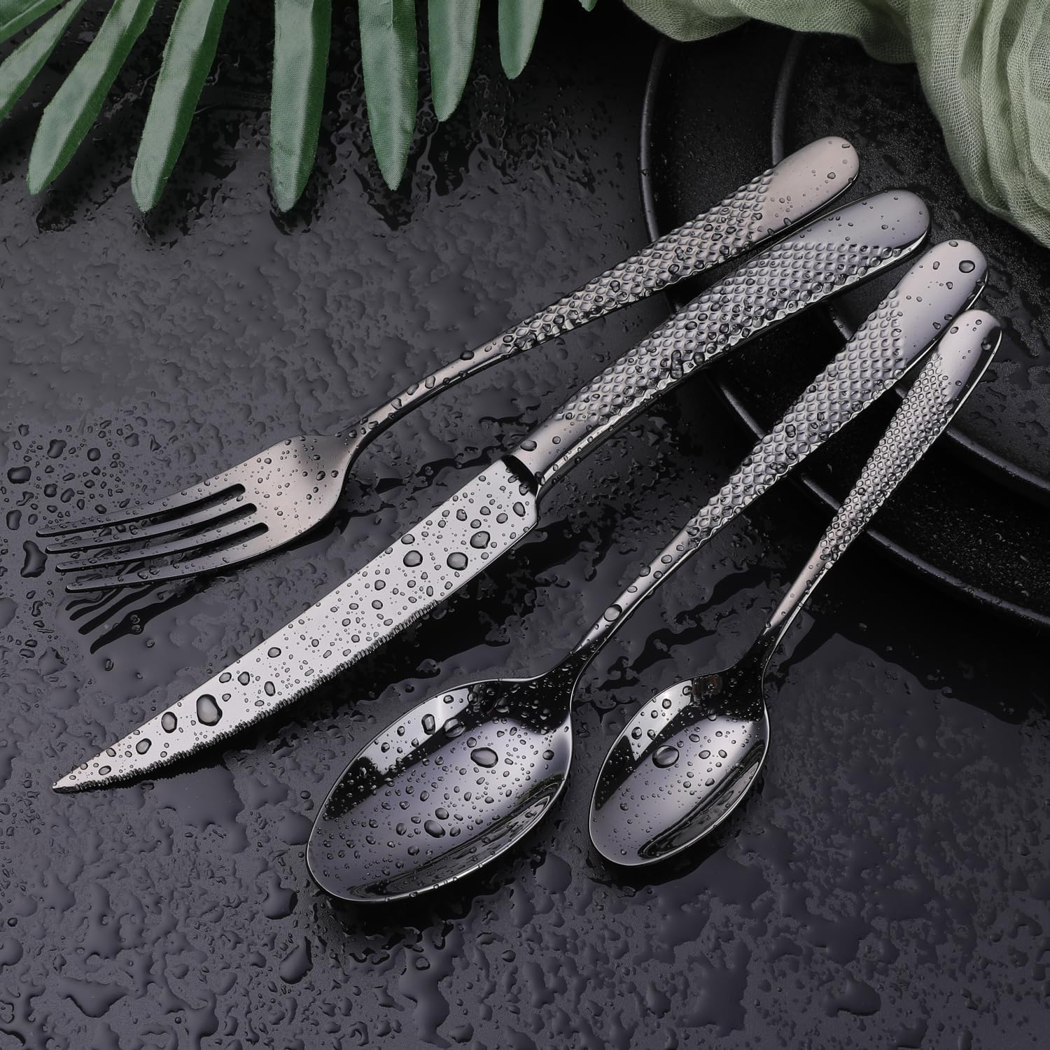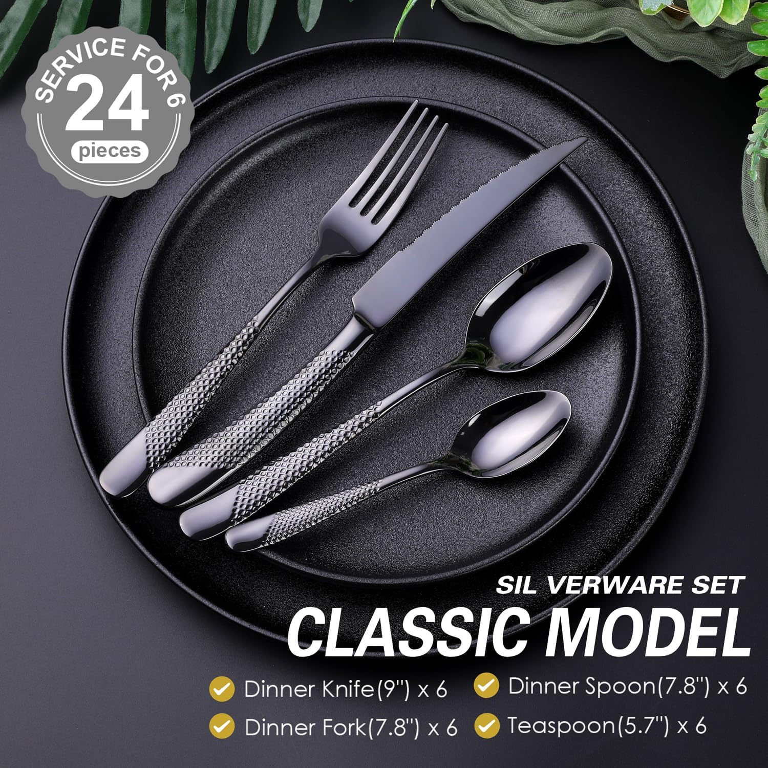 - ă24 PIECES FLATWARE SET FOR 6ă: This hammered black silverware set comes with 6 Dinner Forks, 6 Ultra-sharp 2-in-1 Serrated Knives, 6 Dinner Spoons and 6 Tea Spoons, ideal for home, kitchen or restaurant use.