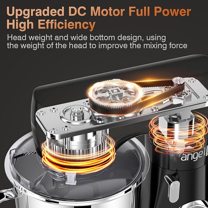 - 【Upgrated DC Motor System 】Mini Angel stand mixers adopt all metal gear structure, with closed gearbox, effectively reduce the sound, speed running stable without stalling with can long service life. And the planetary mixing system which functions more touch points per rotation during mixing process, so that all the mix is stirred at a full extent.