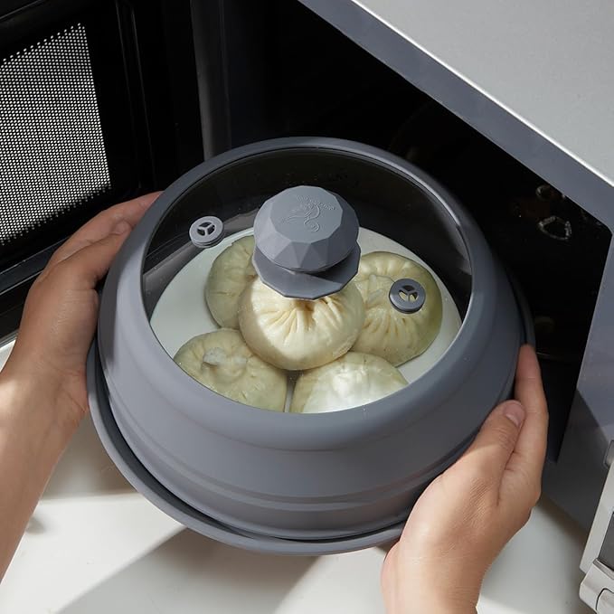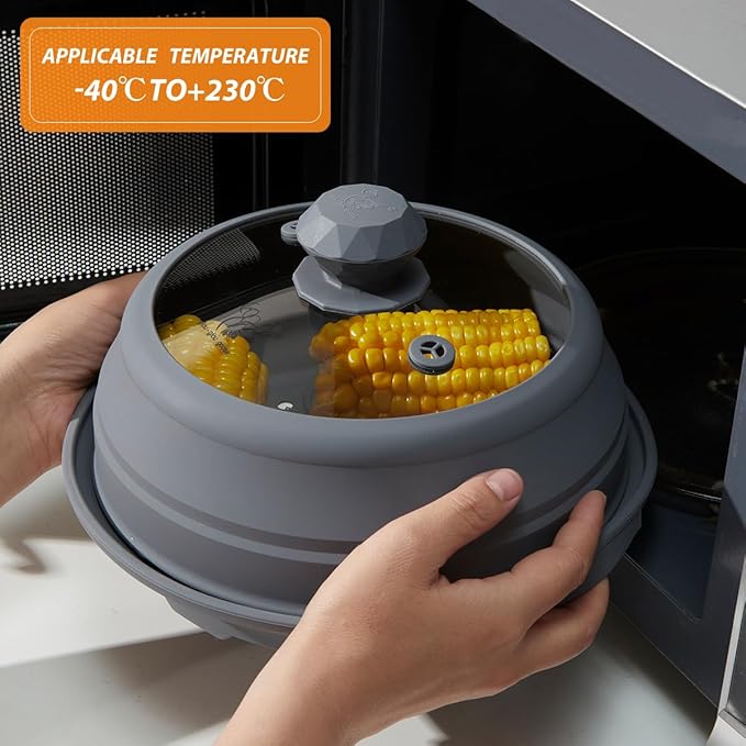 Microwave Splatter Silicone Cover Collapsible, Vented Multifunction Splash Lid with Glass Dish Bowl Plate for Food Cooking Bacon Maker, Dishwasher Safe BPA-Free 9 inch Cookware Set Grey
