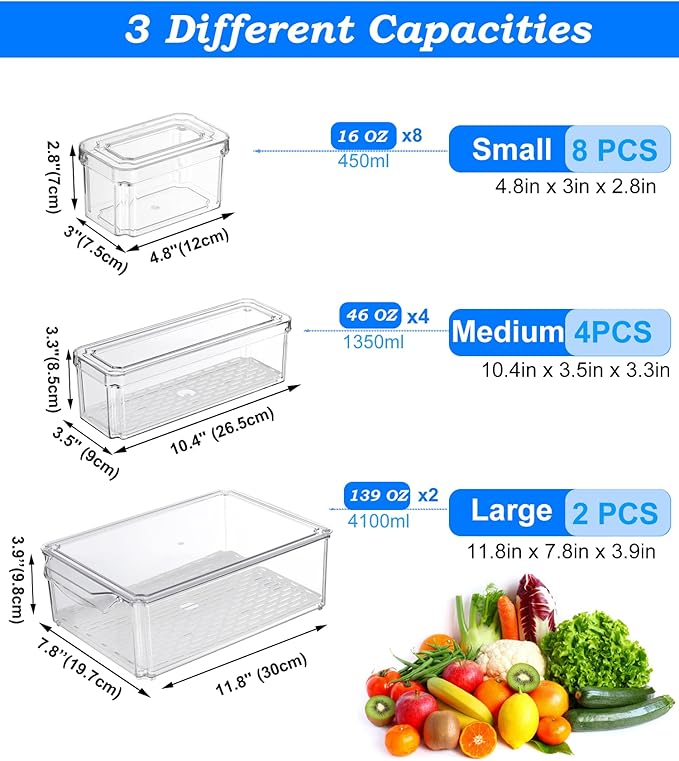 14 Pack Fridge Organizer, Stackable Refrigerator Organizer Bins with Lids, BPA-Free Produce Fruit Storage Containers for Storage Clear for Kitchen, Food, Drinks, Vegetable Storage