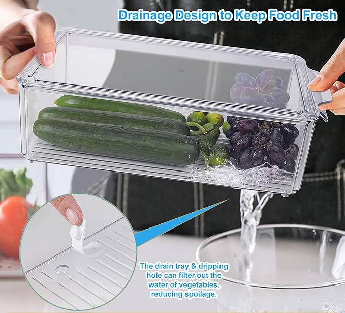 - 【Drain Tray Design】 Our 14 pack refrigerator organizer bins come with a unique tray and dripping hole design at the bottom. This design helps to keep produce elevated and away from moisture, making it possible to store directly after cleaning. It is an effective way to keep food fresh while also extending the shelf life of food in the fridge
