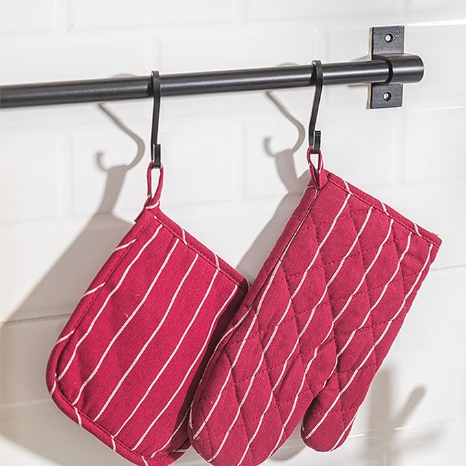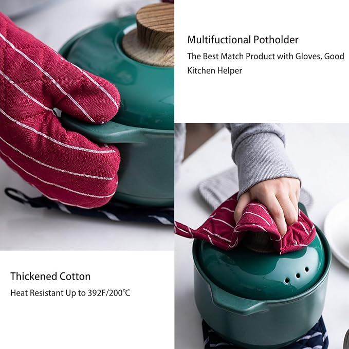 - 【UNIQUE DESIGN】The kitchen oven mitts and pot holder come with rope design, so it is easy to store and hang them via the suspension rings when you are not using, save your room and make your kitchen look more cleaner; The unique grain on the oven mitt and pot holders provide a secure non-slip grip while handling pots and pans