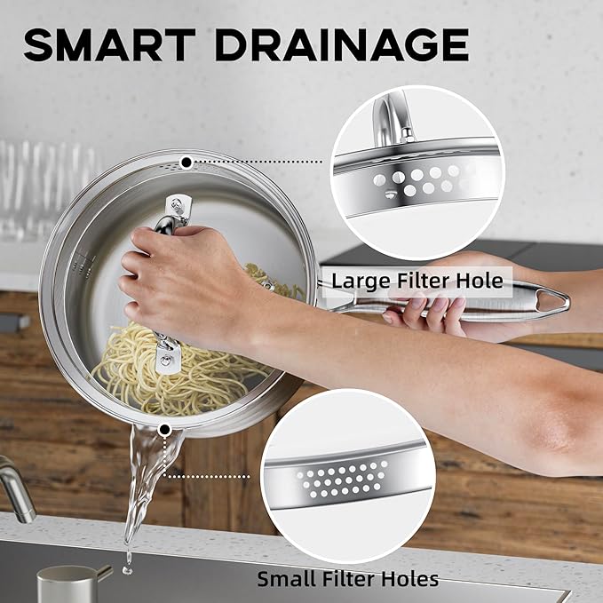 - Efficient Drainage System: Equipped with a large drainage hole on one side and a small drainage hole on the lid, our saucepan allows for easy and precise pouring, giving you control over the amount of liquid you want to drain