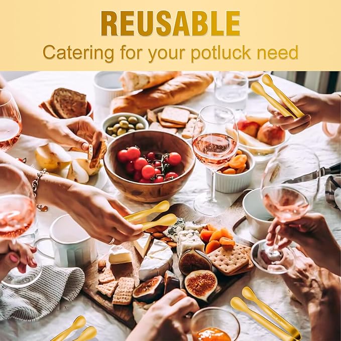 - HIGH-QUALITY -Gold tongs for serving food. The high quality small serving tongs are made of food grade stainless steel for outstanding durability. Don't worry about rust and discoloration. These mini tongs are safe for food contact and long-term use! Smooth edges with no peaked edges for safe use and more comfortable touch.