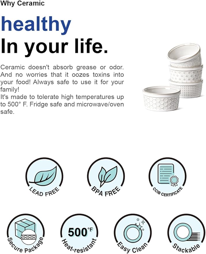 - Premium Ceramic Material:High-temperature fired ceramic ramekin, no lead and no cadmium, can withstand temperatures from -4°F to 482°F. Microwave, oven, and freezer safe, so they can move easily from the oven to the freezer to your dining table