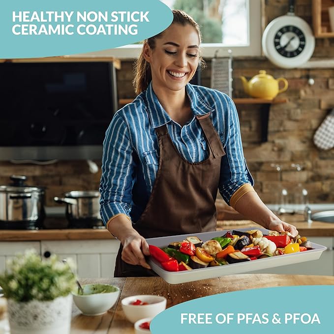 - NON-TOXIC COATING & HEALTHY BAKING - Our large ceramic sheet pan is designed with your health in mind. The cookie sheet is devoid of PTFE, PFOA, PFAS, lead, cadmium, and other harmful agents, ensuring the safety of your food, family, and the planet.