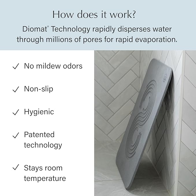 - DRIES INSTANTLY - Our quick-dry stone bath mat, made from diatomaceous earth, holds up to 150% of its weight in moisture and evaporates it within seconds. This ceramic-like material feels like natural stone, offering a hygienic and durable alternative to traditional bath mats.