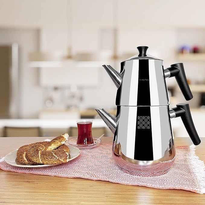 Serenk Stainless Steel Turkish Teapot Set, Double Kettle Set with Non-Slip Bakelite Handles, 101 Oz Black