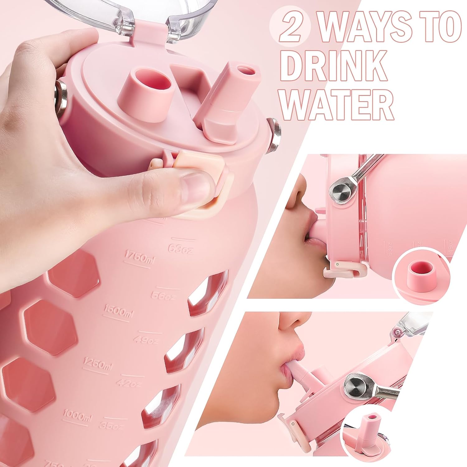 MUKOKO 64oz Glass Water Bottles with Straw and Lid,Half Gallon Water Bottle with Time Marker,Large Glass Water Jug with Silicone Sleeve and Stainless Steel Handle-Pink