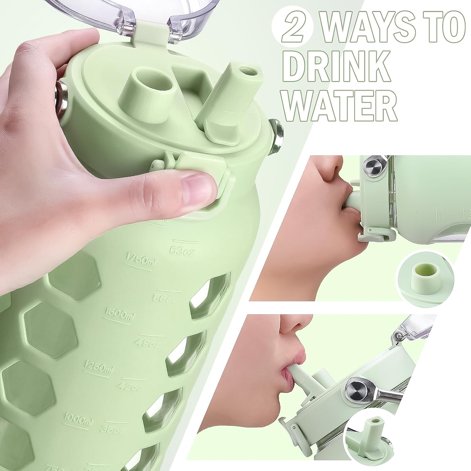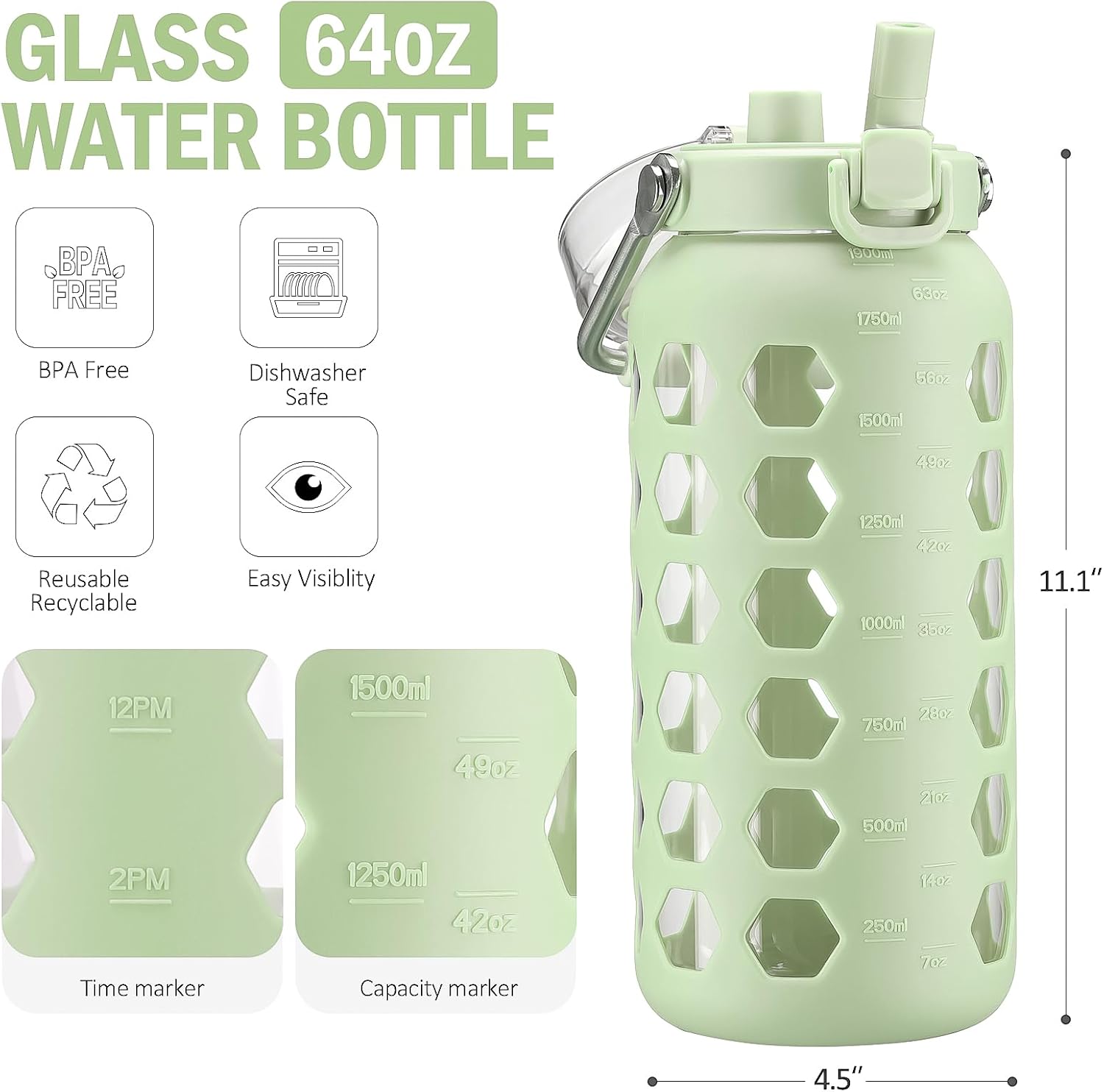 MUKOKO 64oz Glass Water Bottles with Straw and Lid,Half Gallon Water Bottle with Time Marker,Large Glass Water Jug with Silicone Sleeve and Stainless Steel Handle-Green