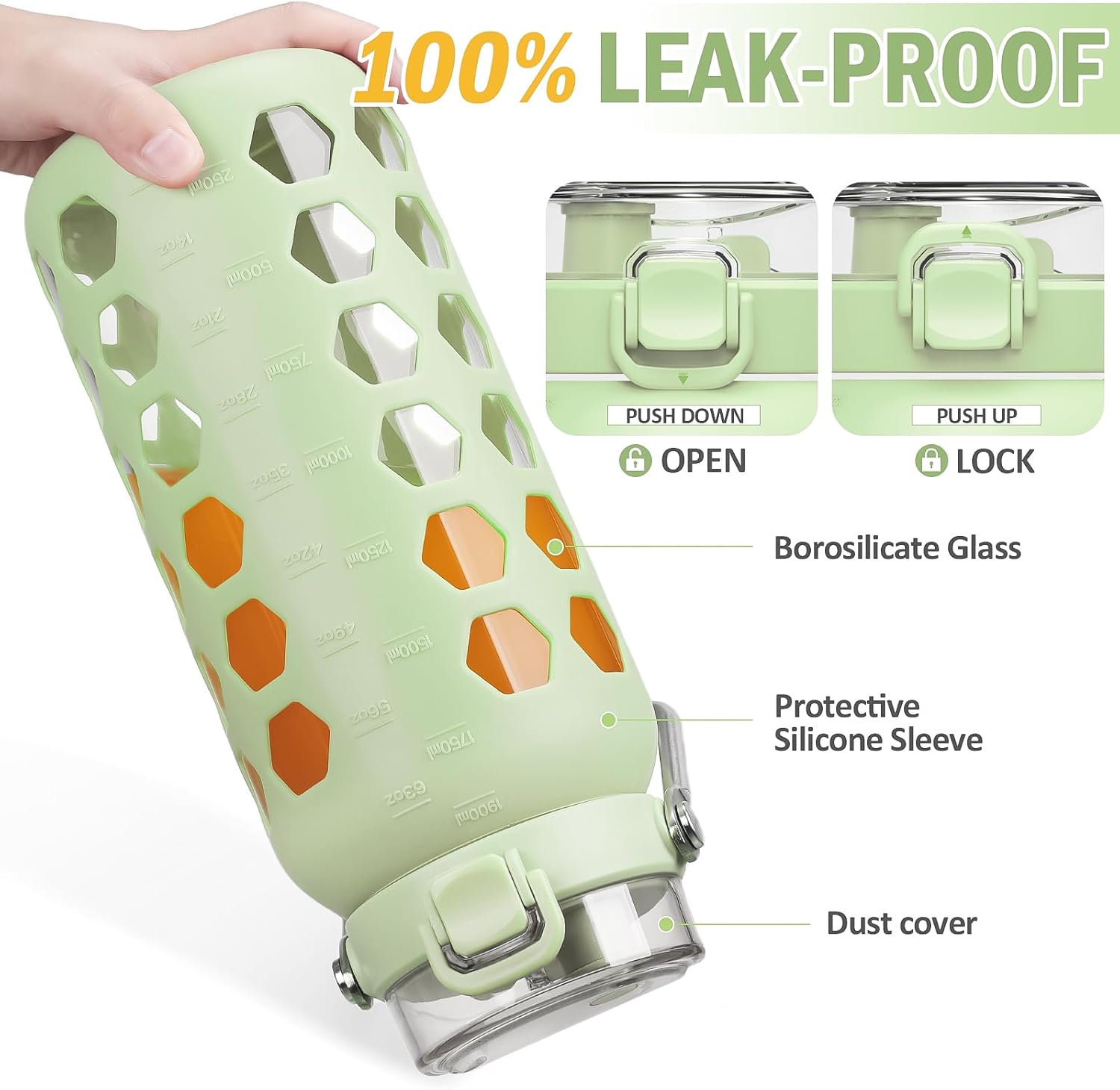 - GLASS BOTTLE WITH SILICONE COVER - The water bottle is designed with high-quality silicone cover, which is anti slip, heat insulation, and ice insulation, effectively protecting the inner liner, preventing scalding, wear-resistant, and sturdy.