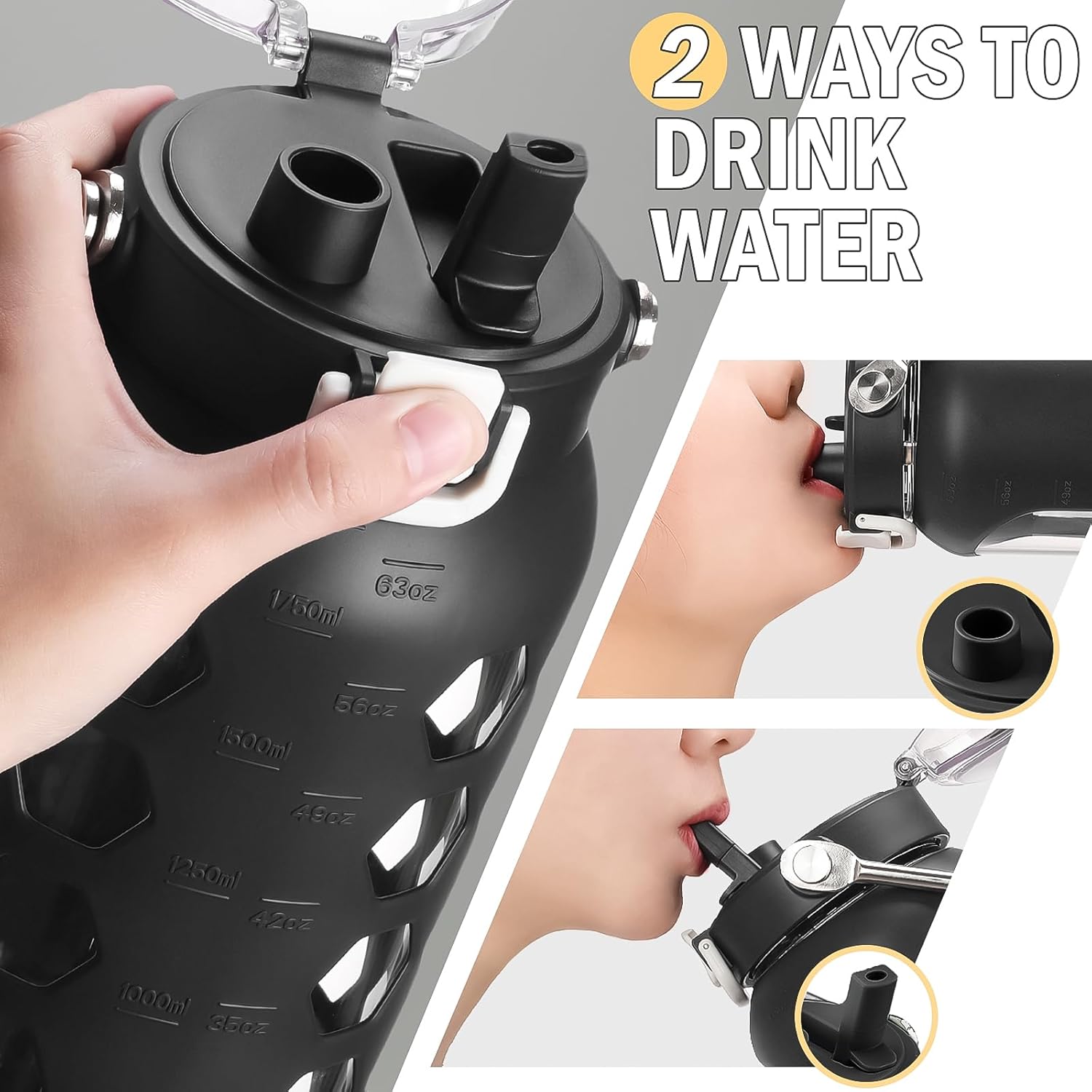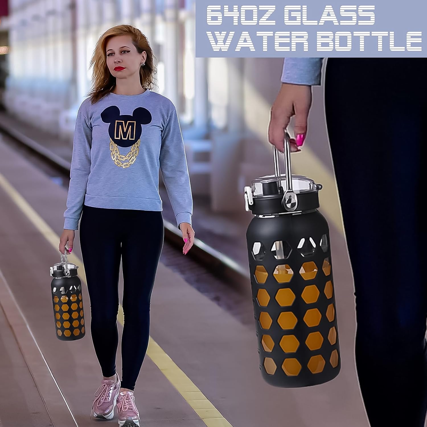 MUKOKO 64oz Glass Water Bottles with Straw and Lid,Half Gallon Water Bottle with Time Marker,Large Glass Water Jug with Silicone Sleeve and Stainless Steel Handle-Black