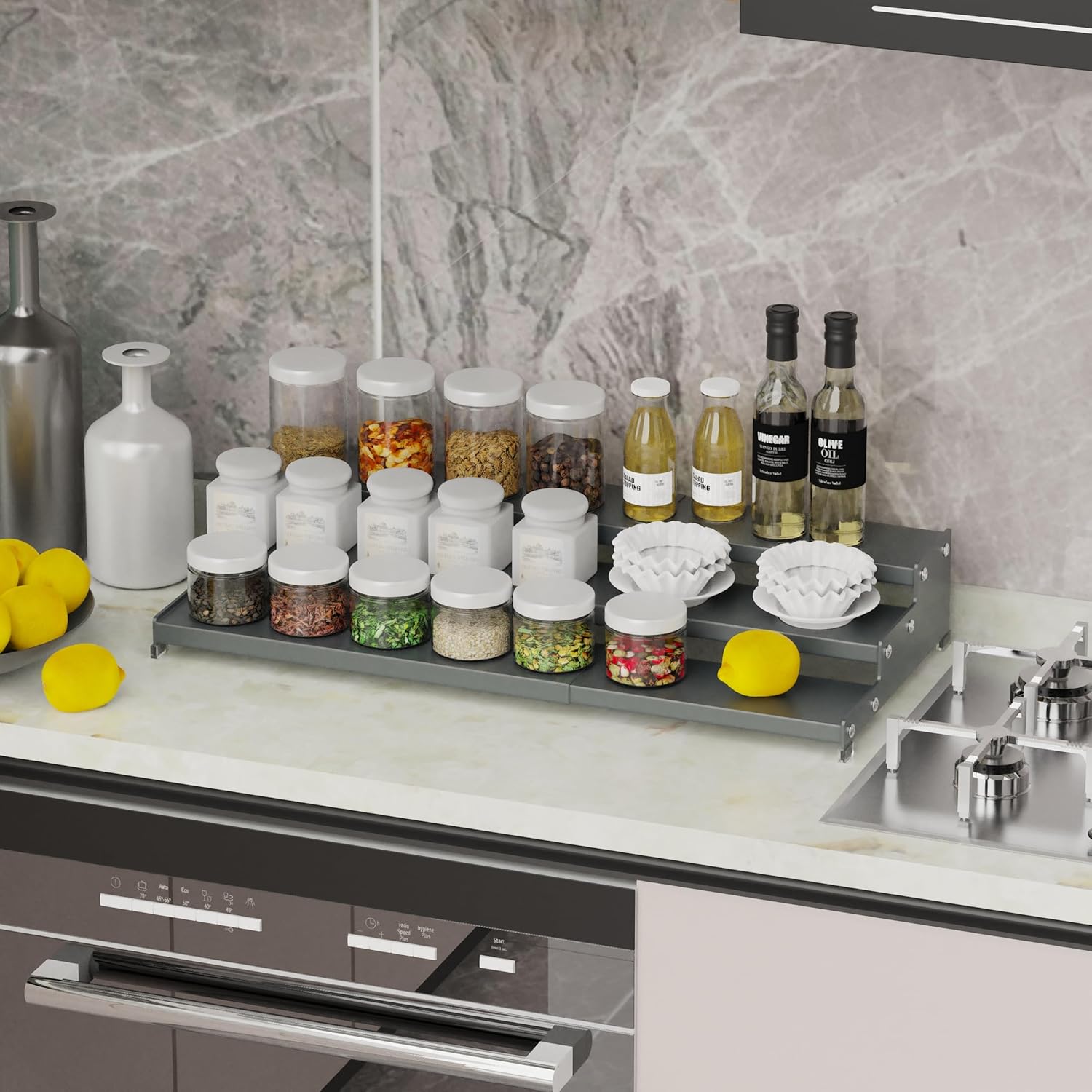Expandable Spice Rack Storage organizer with 3-Tier step shelf cabinet,seasoning rack organizion.Great for Kitchen countertop shelves,Bathroom,dressing table,Cupboard,Pantry and more(2packs/Gun-gray)