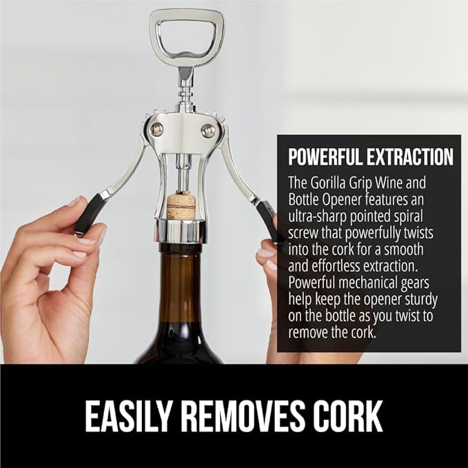 GORILLA GRIP BPA-Free Sharp Wine Opener, Heavy Duty Zinc Alloy Wing Corkscrew, Multifunctional Bottle Opener, Remove Corks or Cap, Easy to Use Bar Cork Screw, Dishwasher Safe Kitchen Essentials, Black