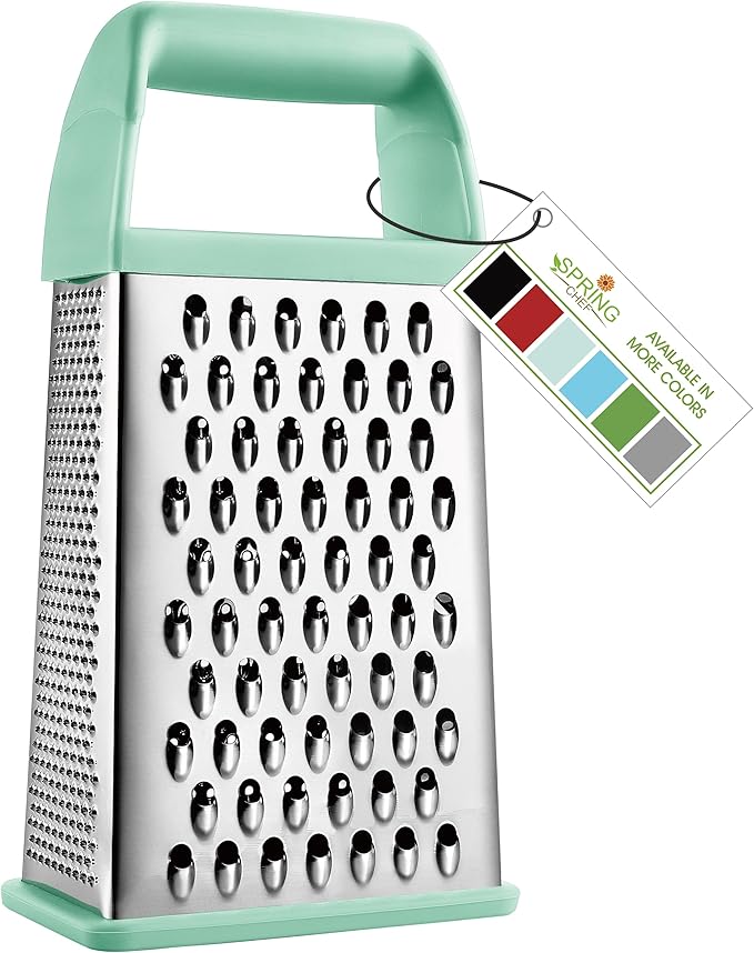 Spring Chef Professional 10" Stainless Steel Parmesan Cheese Grater with Handle, 4 Sided Handheld Box Grater, Kitchen Potato Shredder for Hash Browns, Hard Cheese, Ginger, Vegetables, Carrot - Mint