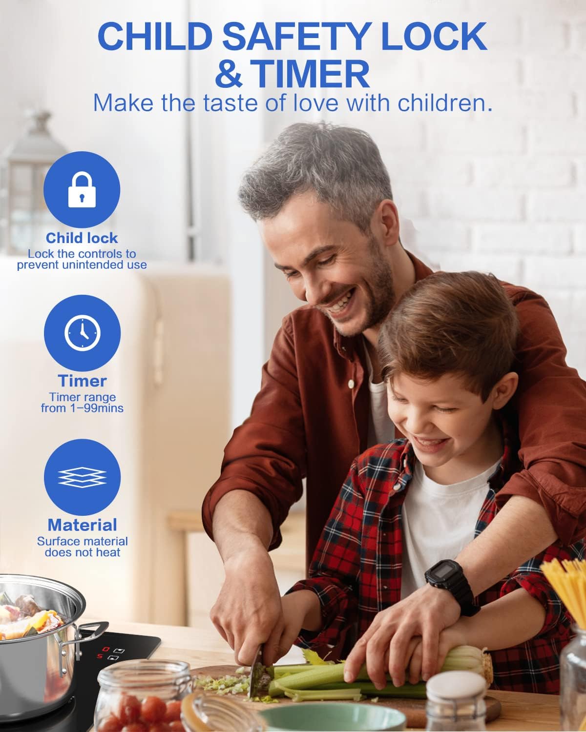 - [STYLISH AND CONVENIENT INDUCTION BURNER] Feature premium tempered black glass panel that seamlessly combines elegance with functionality, making it an ideal addition to any modern kitchen. The 12 inch induction cooktop features an intuitive 99-minute timer and handy child lock function, allowing you to set precise cooking durations and experience the convenience of freeing yourself from waiting by the stove.