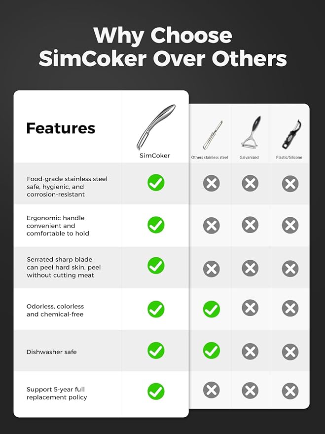 - 5-Year Warranty & 100% Satisfaction:Includes a 5-year warranty and satisfaction guarantee. Peels fruits and vegetables smoothly, ensuring a hassle-free cooking experience