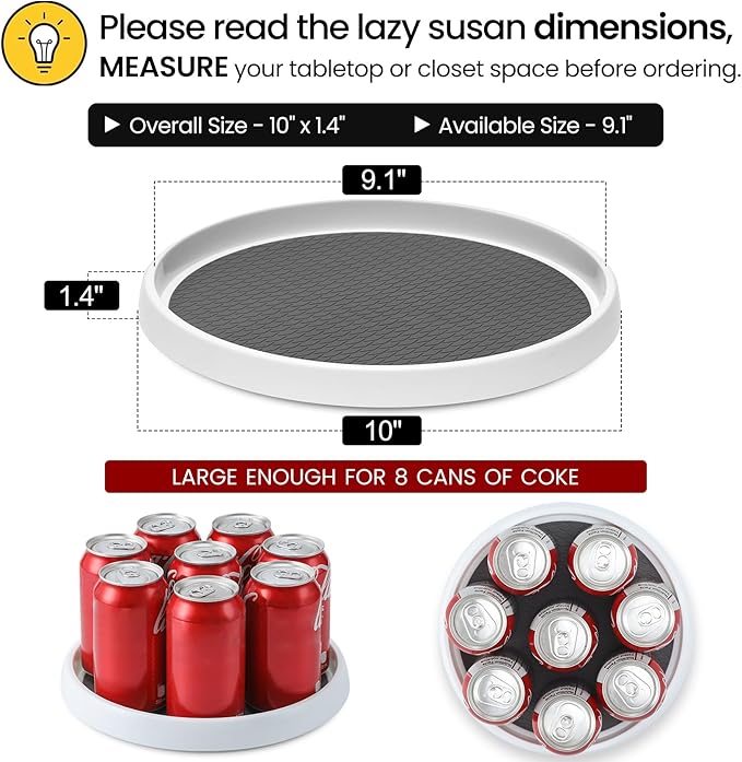 - [ Please Note ] - The lazy susan is large enough for 8 cans of coke (refer to the 2rd image). Please read the lazy susan dimensions and measure your tabletop or closet space before ordering in case it doesn't fit. Overall Size - 10" x 1.4". Available Size - 9.1"