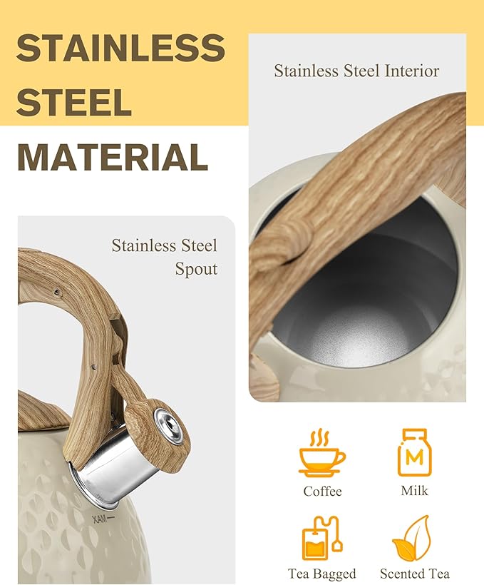 Tea Kettle Stovetop Teapot, 2.5 Quart Loud Whistle Food Grade Stainless Steel and Smooth Wood Pattern Handle, Sophisticated Look for Hiking, Picnic, for Tea, Coffee Milky White