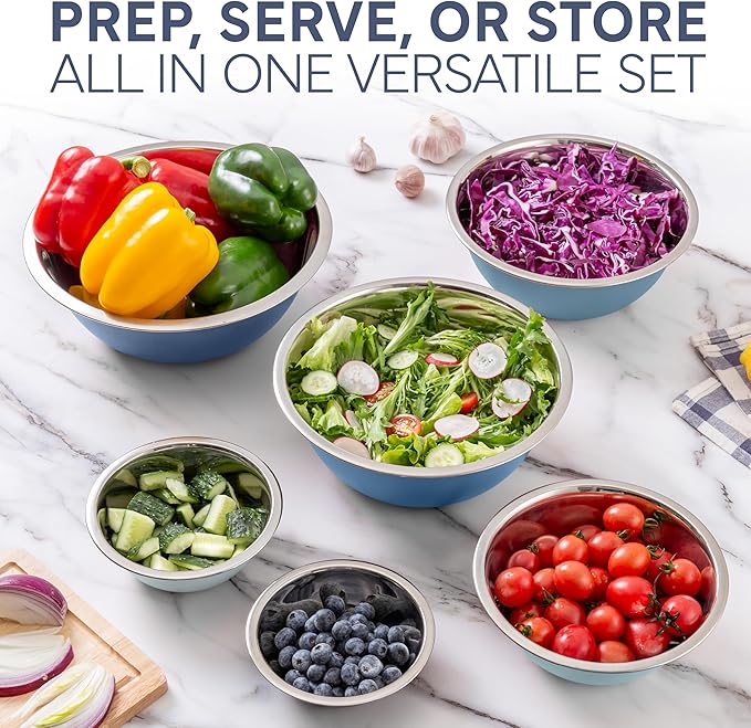 - 6 Piece Stainless Steel Nesting Bowls Set includes 6 Prep Bowl and Mixing Bowls - a practical set of easy to clean kitchen bowls that can be used for food prep, serving and storing.