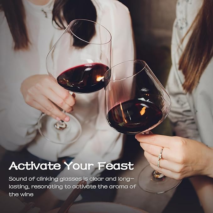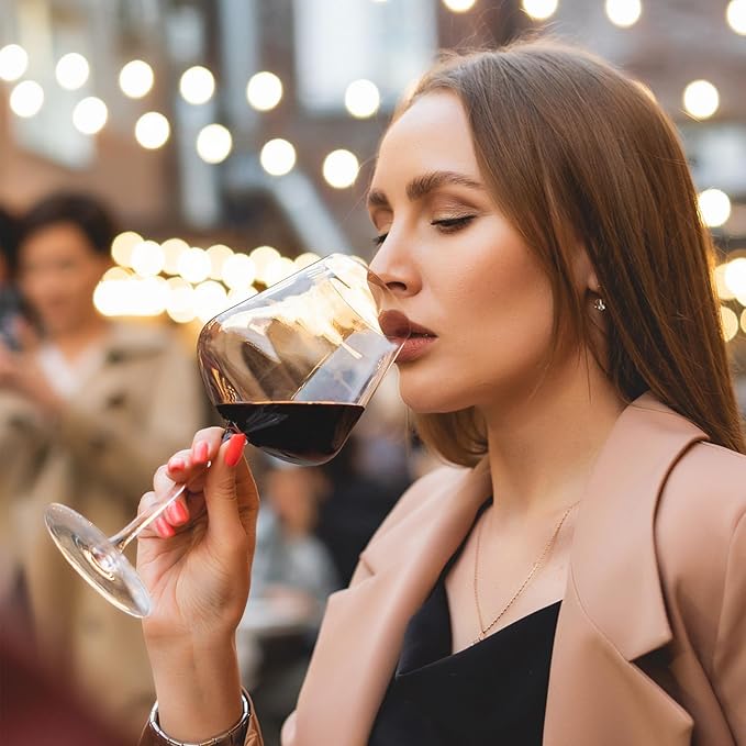- Super Large & Elegant - One of the largest wine glasses on the market -28oz, with an oversized pool and elegant shape, not only make the glass look so elegant and noble, but also guide the wine flow to the most suitable tasting area. The large belly can better gather the aroma of the wine, allowing you to fully feel the mellow aroma of a good wine with every sip.