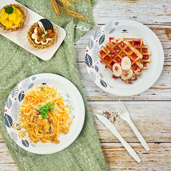 JOLLY CHEF 280 Count Paper Plates 8 inch Soak Proof, Cut Proof, Heavy Duty Leaf Printed Disposable Paper Plates for Everyday Use