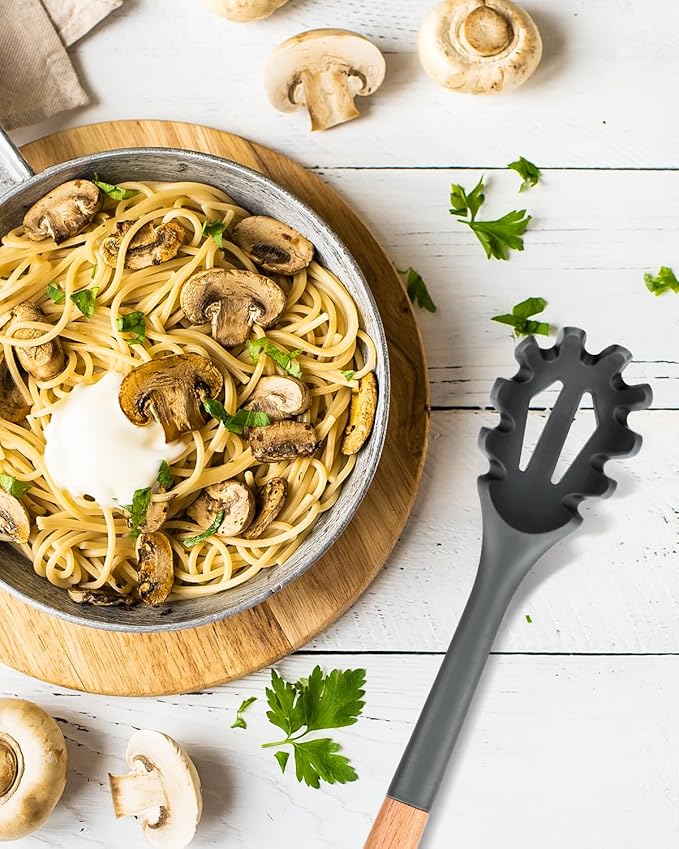 Silicone Pasta Fork, Kitchen Heat Resistant Noodle Spoon Server, BPA Free Spaghetti Strainer,12.8 inch (Grey)