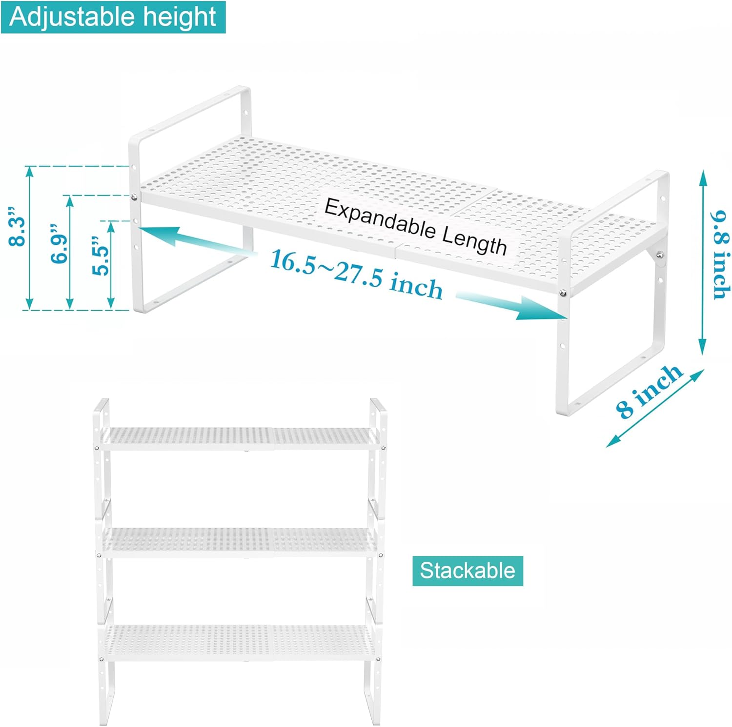 - 【Expandable and stackable design】--The Adjustable Countertop Organizer (collapsed) measures 16.5" L x 8" W x 9.8" H, expands from 16.5" to 27.5" length. You can also stack two shelves together to create a two-tier storage space.