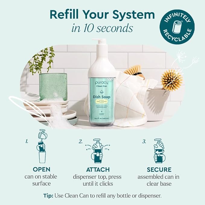 - Refill in Seconds - Clean Can systems allow you to refill your liquid dish soap in a heartbeat. Open your can of Puracy dishwashing soap, attach the spray top, then secure. No mess, just ready-to-use liquid dish detergent that keeps things simple.