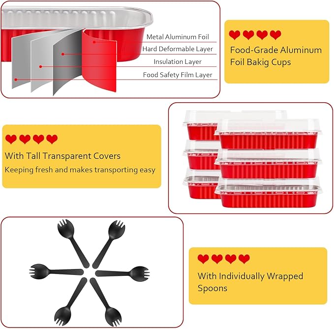 - 【Pack of 100 Sets】 - Including 100pcs mini cake pans with 100 clear lids,and 100 individually wrapped spoons.The mini loaf pan size:6.5”x2.5”x1.2”,the dome lids 0.8” high.Abundant small cake pans with lids are great for bake shops,big parties.