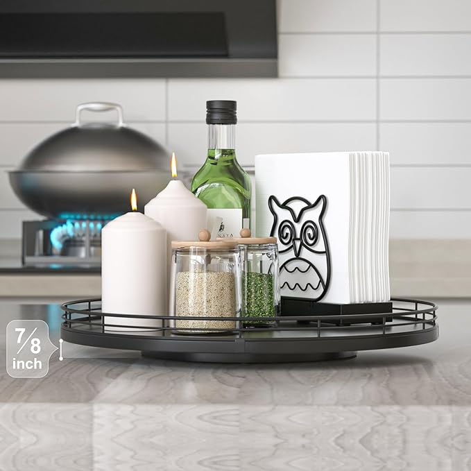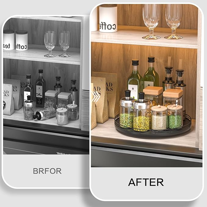 - ๐ง๐ต๐ผ๐๐ด๐ต๐๐ณ๐๐น ๐๐ฒ๐๐ถ๐ด๐ป: The turntable tray features a smooth and silent 360ยฐrotation; Bottom slip-resistant pads for stability and protect your countertop from scratches; Raised edges on each organizer tray to keep items from falling out; Easy to use, no installation required