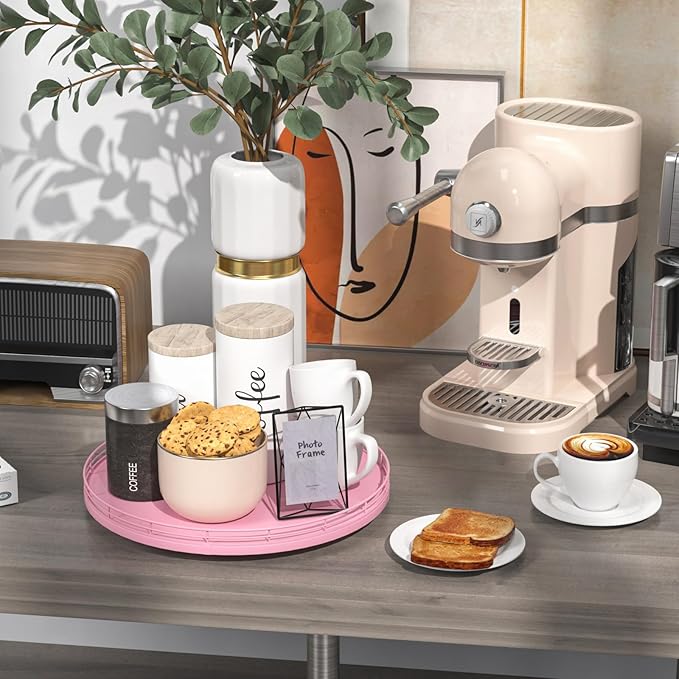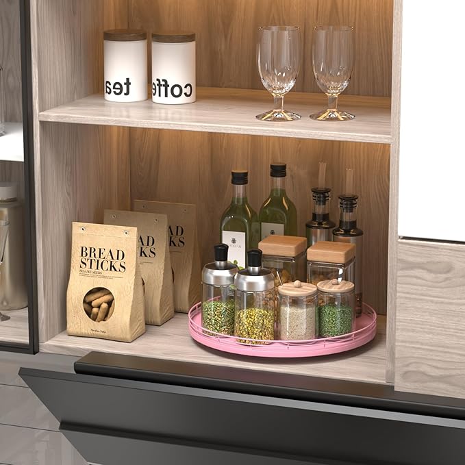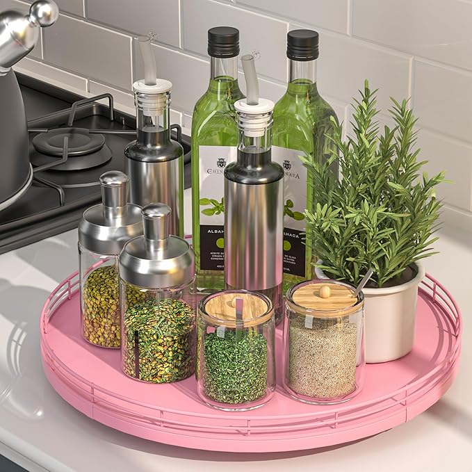 - ๐ง๐ต๐ผ๐๐ด๐ต๐๐ณ๐๐น ๐๐ฒ๐๐ถ๐ด๐ป: The turntable tray features a smooth and silent 360ยฐrotation; Bottom slip-resistant pads for stability and protect your countertop from scratches; Raised edges on each organizer tray to keep items from falling out; Easy to use, no installation required