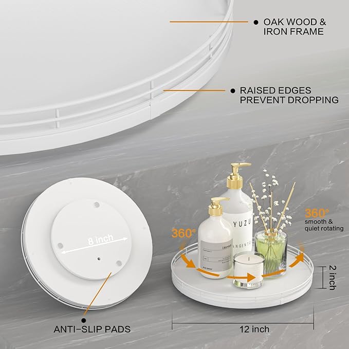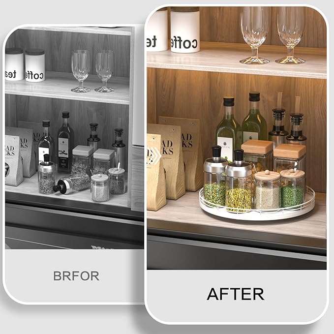 - ๐ง๐ต๐ผ๐๐ด๐ต๐๐ณ๐๐น ๐๐ฒ๐๐ถ๐ด๐ป: The turntable tray features a smooth and silent 360ยฐrotation; Bottom slip-resistant pads for stability and protect your countertop from scratches; Raised edges on each organizer tray to keep items from falling out; Easy to use, no installation required