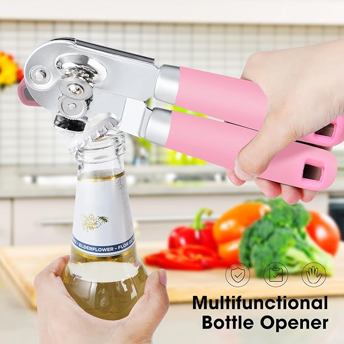 Beneno Can Opener Manual with Magnet, Hand Held Heavy Duty Can Opener with Durable Sharp Blade Smooth Edge, Big Effort-Saving Knob, Soft Grip Rubber Handle, Multifunctional Bottle Opener, Pink
