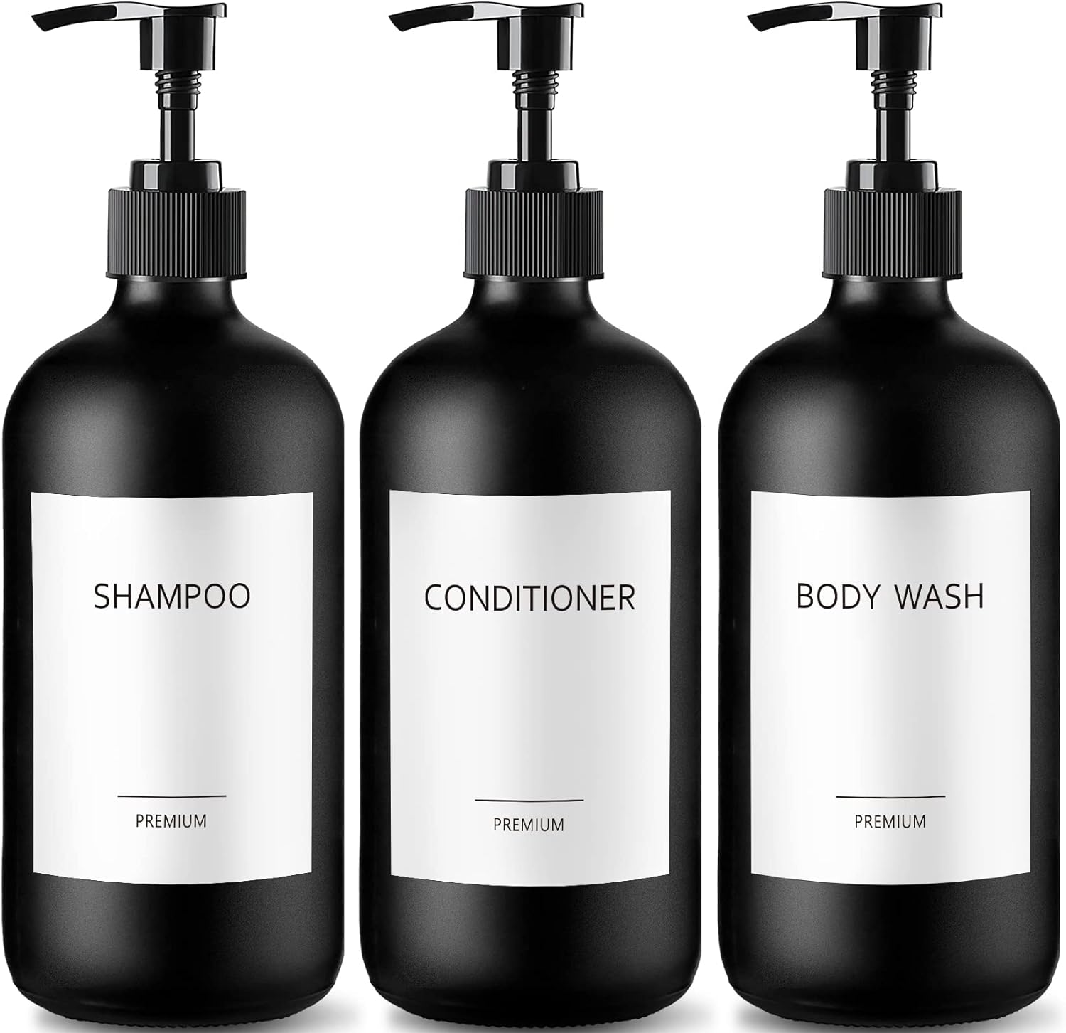 GMISUN Black Shampoo and Conditioner Dispenser, Shower Soap Dispenser Bottles with Labels, Refillable Shampoo Conditioner Body Wash Dispensers, Glass Soap Pump Dispenser Set for Bathroom Shower