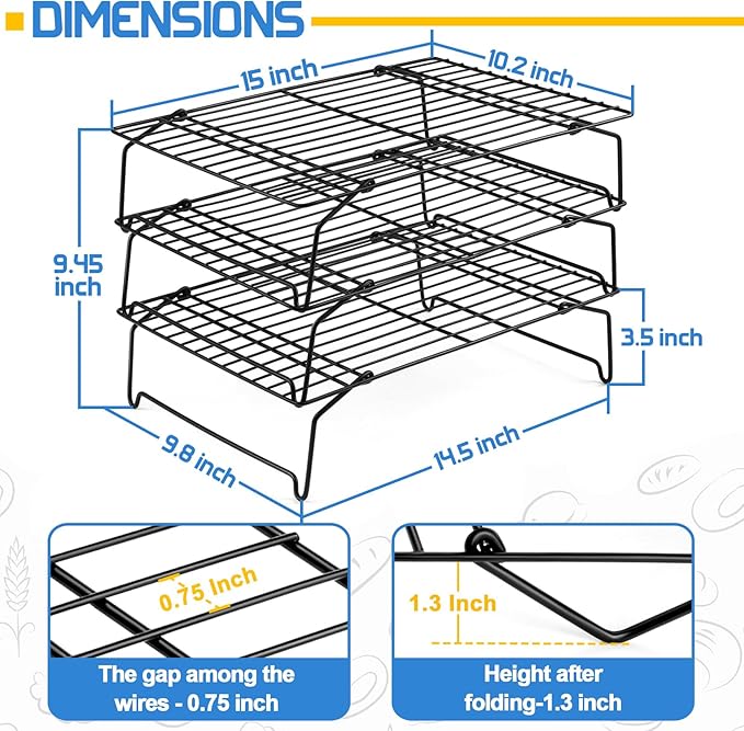 - 【UTILITY & MULTIPLE USES】Elevated feet and equidistant wires promote optimal air circulation for bake evenly and cool quickly, Heat-resistant for oven use, Each rack 15” L x 10.2” W, Fit in 16” x 11” pan, 3 Pack stackable racks have multiple uses, such as expended use, folded use and stacked use,etc, Perfect for baking, roasting, cooling and dehydrating, draining and drying