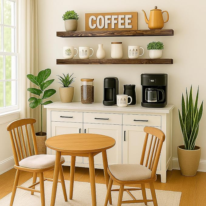 - Solid Wood Floating Shelves: The 60 inch wood Floating Shelf is made from 100% solid pine, selected for its beautiful wood grain texture and knotted into points, with a sanded, hand-stained finish that gives the space a rustic, natural, warm feel. Note: All steps are done by hand and each ledge is slightly different, but equally stunning!