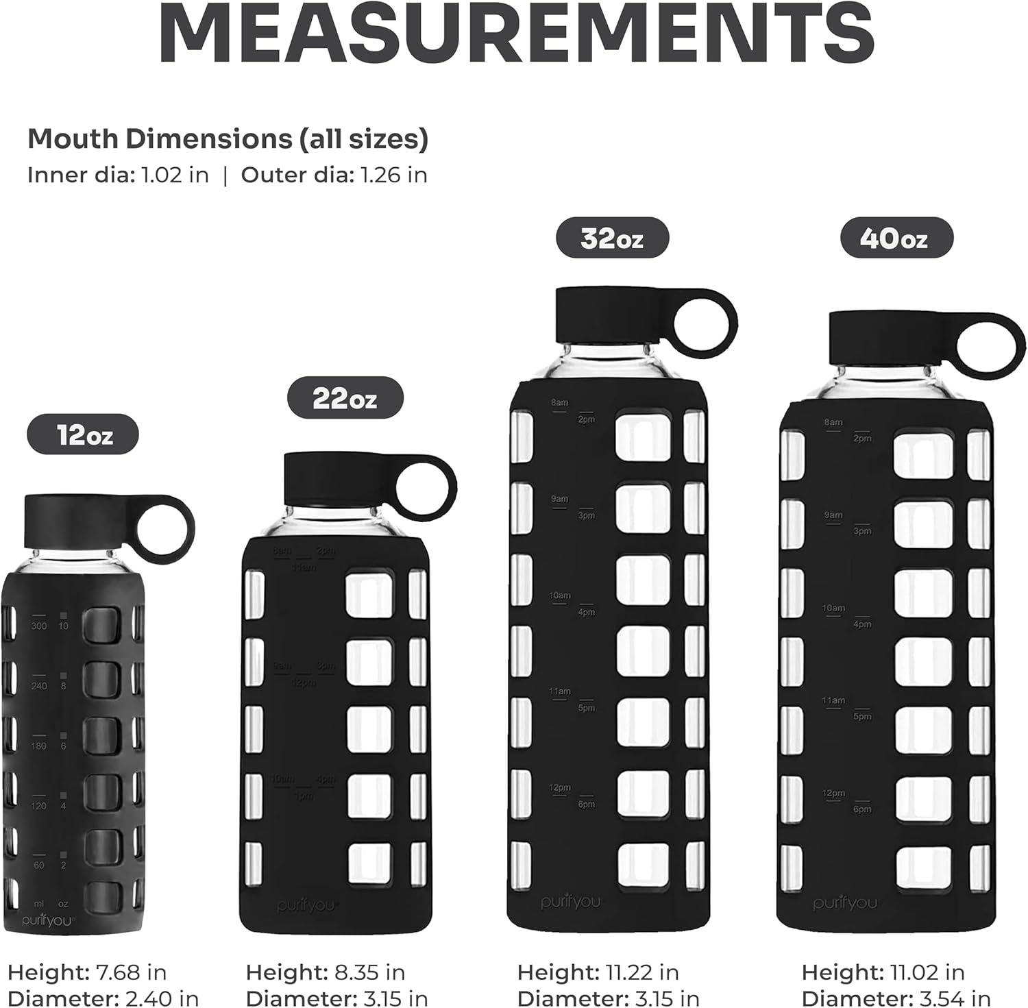 purifyou 40oz / 32oz / 22oz / 12oz Borosilicate Glass Water Bottle with Time & Volume Markers, Silicone Sleeve, Stainless Steel Lid – Reusable Glass Bottle for Water & Juice (22oz Jet Black)