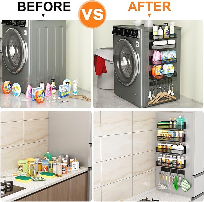 - Multi-Use Magnetic shelves: Can be used on all magnetic surfaces of your home and kitchen, such as the side wall of your refrigerator to hold spices, oils, utensils, plates, mugs, towels or other essentials. Our moveable magnetic fridge organizer can also be used on the side of an oven, microwave or washing machine for storage.