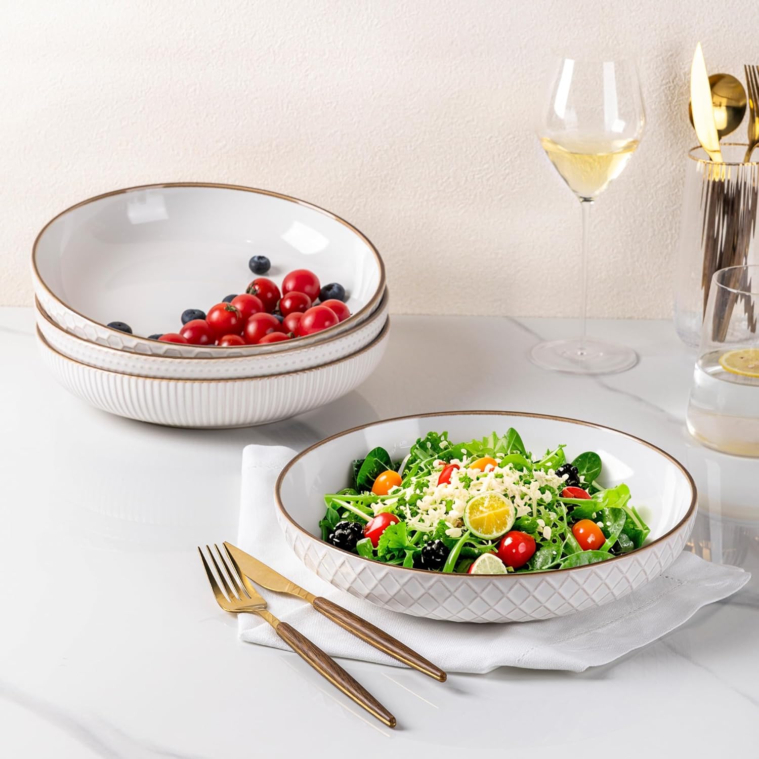 GBHOME 9.5'' Large Pasta Bowls, 42 Ounce Stoneware Salad Bowls for Kitchen, Ceramic Serving Bowls With Textured Pattern for Pasta,Fruit, Stews,Noodle, House-warming Gift,Set of 4-Off White