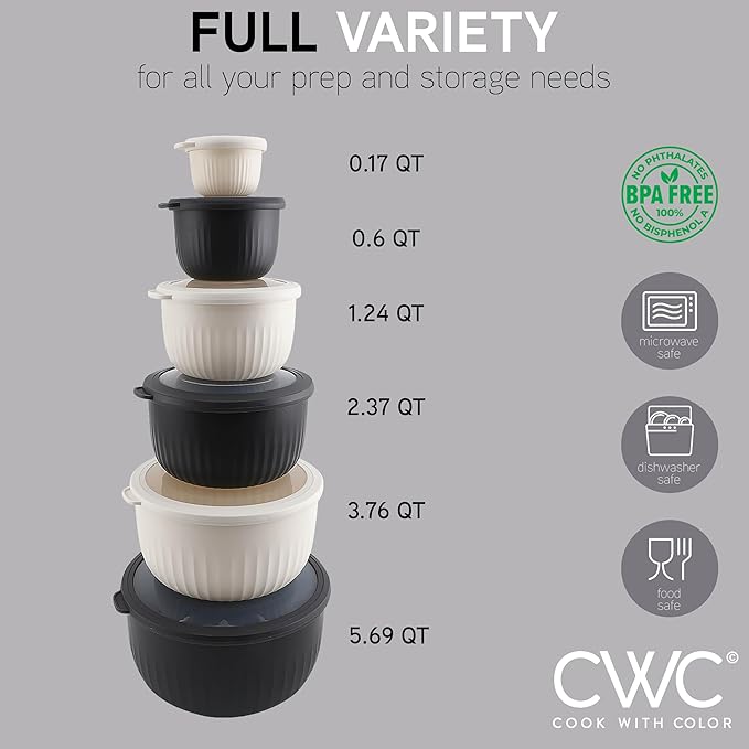 - Cook with Color 12 piece plastic mixing bowl set - non slip bowls with lids; easy to clean, sturdy mixing bowls.