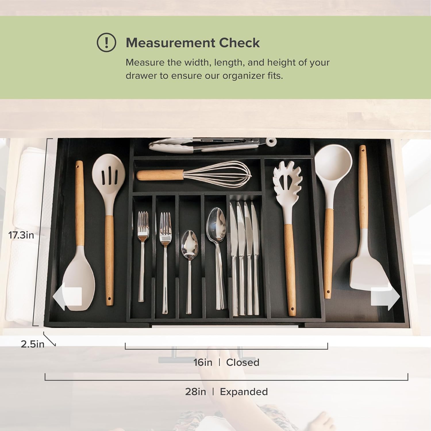KitchenEdge Premium Silverware, Flatware and Utensil Organizer for Kitchen Drawers, Food-Safe Contract Grade, Expandable from 16 to 28 In, Black Bamboo