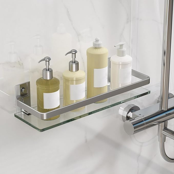 Danpoo Clear Tempered Glass Wall Shelf, Wall-Mounted Organizer for Bathroom, Kitchen(Matte Silver)