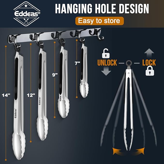 - FOOD GRADE STAINLESS STEEL: Kitchen tongs The heavy duty EDDEAS kitchen tongs built with stainless steel, sturdy, heat resistance, anti-rust, anti-corrosion, light weight, easy to handle like new forever. This tongs for cooking comes with a set of 4, standard 7" Serving Food Tongs 9" cooking tongs 12" and large sized 14" BBQ grill tongs.