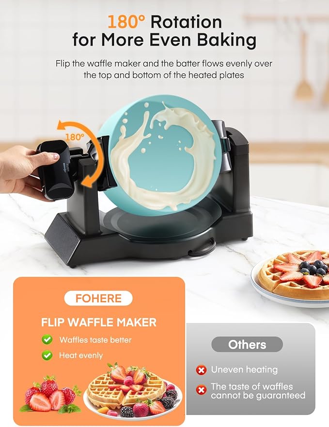 - 【180° ROTATION COOKING SYSTEM】 The special Rotating cooking system lets gravity do the work to churn out ideal fluffy waffles. FOHERE 180° flip waffle maker ensures batter is evenly distributed for evenly-cooked fluffy waffles, browned on both the top and the bottom with no bald spots. Extra-Deep grids churn out waffles with room for all your favorite toppings.