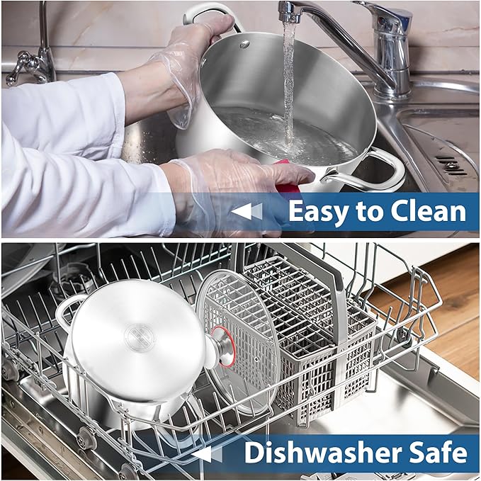 - TRI-PLY DESIGN: Tri-ply stock pot consists of 18/10 stainless steel interior aluminum core and 18/0 stainless steel exterior, The heat transmission is uniform and fast during cooking, Good thermal insulation performance and save or electricity, Healthy and durable for daily cooking steaming use, Easy to clean and dishwasher safe