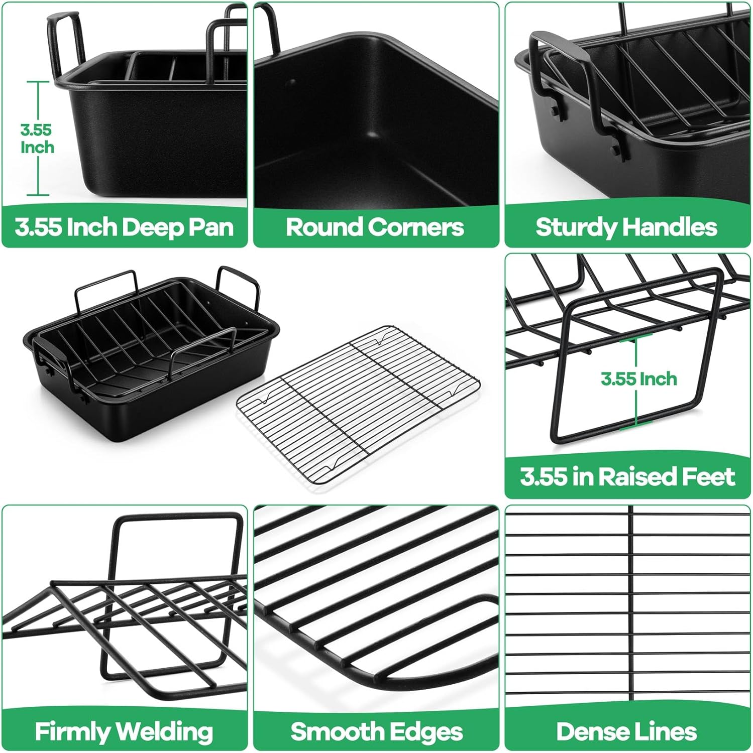 - 【WELL-MADE ROASTING PAN】14 Inch roasting pan is perfect for roasting turkey chicken, baking lasagna brownie, 3.65” deep side can contain more food or sauce without spilling out, Keep your oven tidy, Firmly riveted handles ensure sturdy and safe holding, No worries of falling apart, Round corners help to easily clean food residue